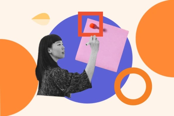 Adding a digital course graphic where a woman is writing notes for students, as well as a post it and colorful shapes